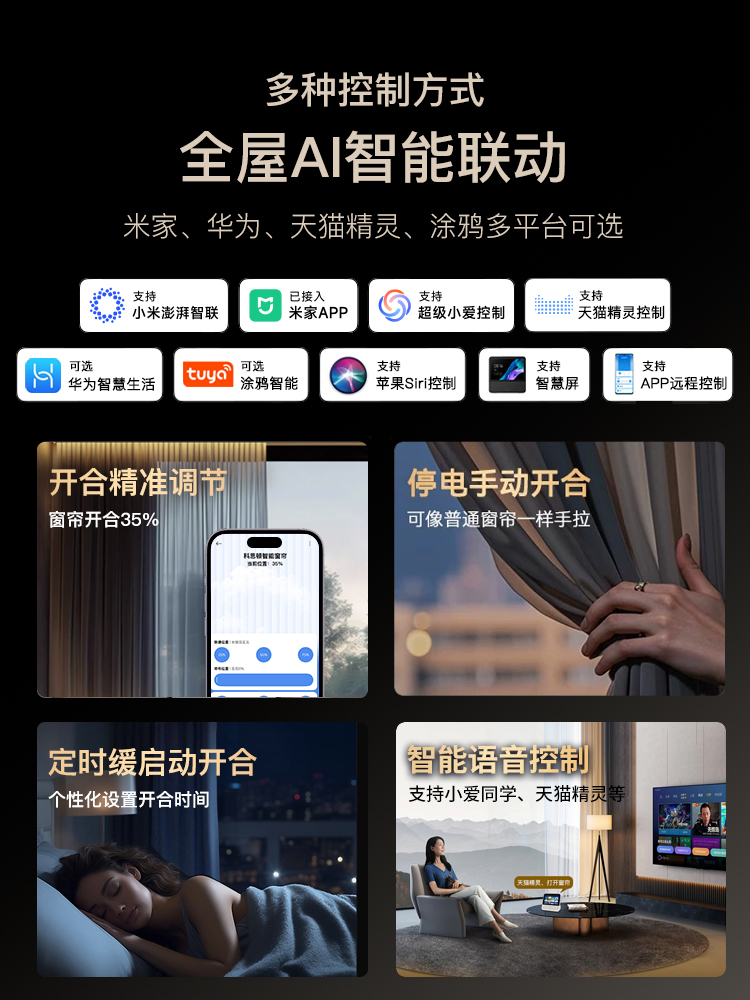作为唯一支持米家、华为、涂鸦等六大平台的品牌,科思顿打破了智能家居生态壁垒,实现了“回家自动开帘”、“睡眠关帘联动安防”等场景化应用。