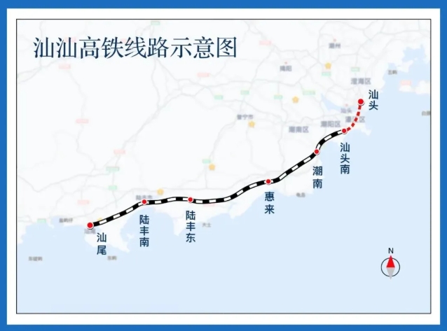 汕汕高铁起自汕头站,途经广东省汕头、揭阳、汕尾3市8区县,接入广州至汕尾高铁汕尾站。线路全长162公里,设计时速350公里,共设汕头、汕头南、潮南、惠来、陆丰东、陆丰南、汕尾7座车站。汕汕高铁汕头南至汕尾段已于2023年12月26日开通运营。