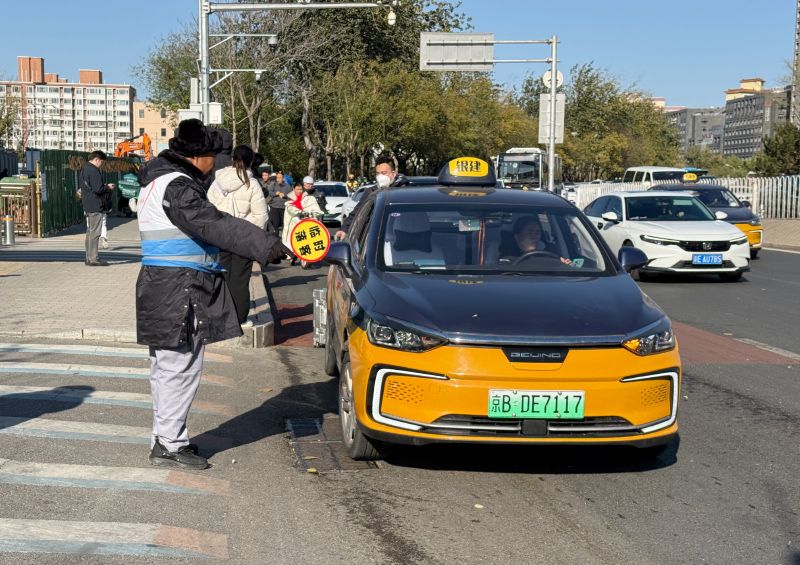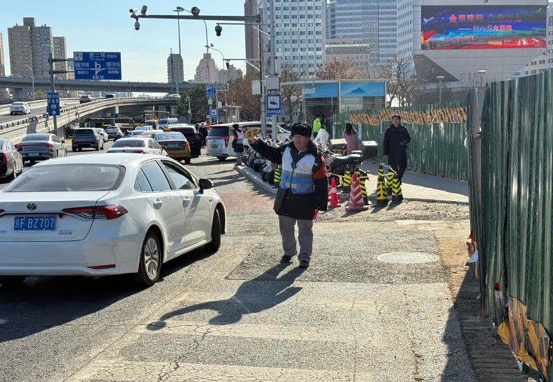 工作人员在北站东门临时落客区疏导车辆。送站车辆可按照现场交通标识指引,行至临时落客点停靠或周边停车场,临时落客点设置在北京北站东门附近区域。