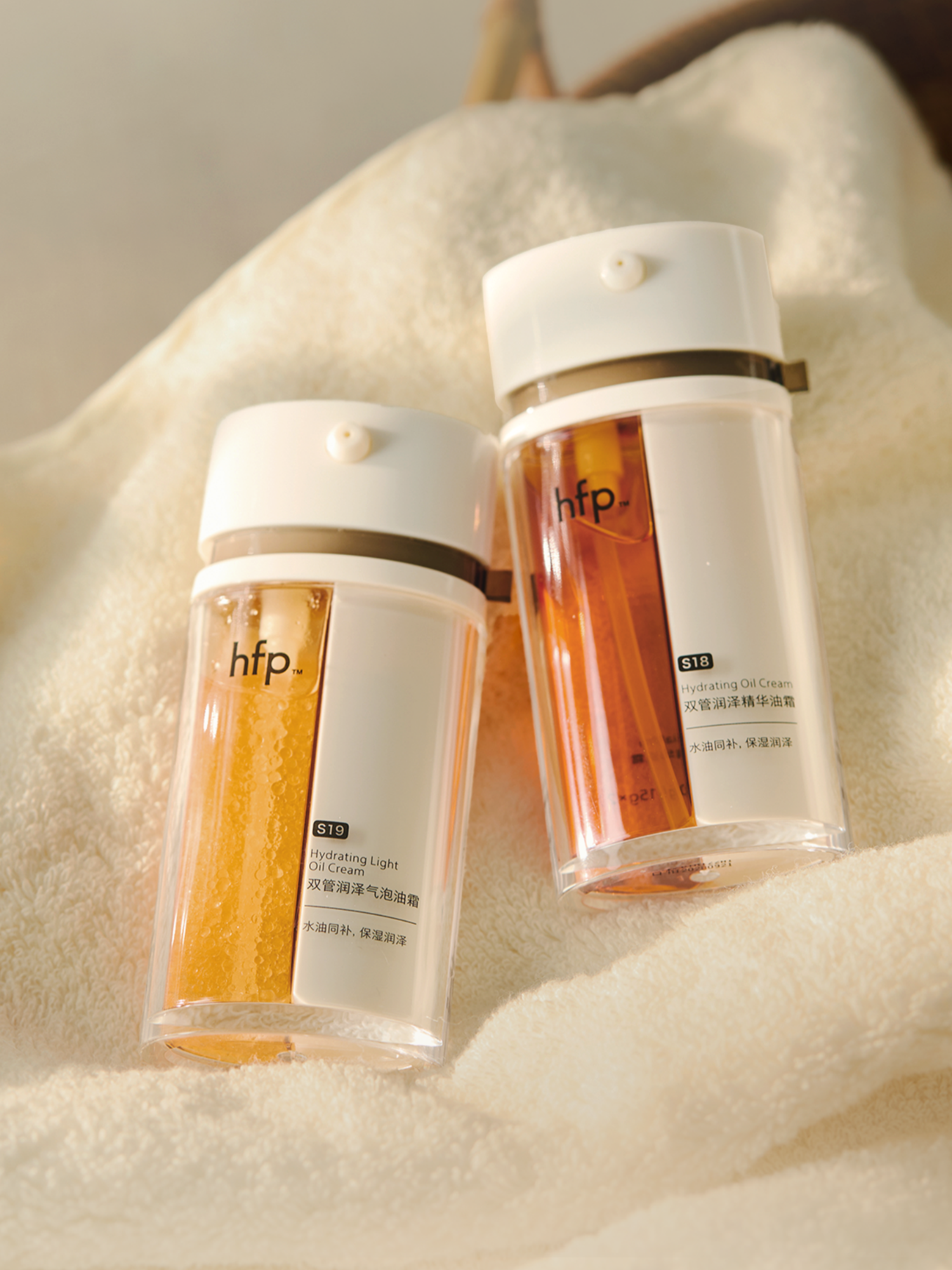 养肤的精华油跟滋润的面霜通过特殊的双管设计集结在一起,既实现了高效滋养、又涵盖了高度滋润的需求。双仓的设计按压出来是1:1的油霜混合质地,兼顾了滋润度的同时、减少了油感,实现了清爽的以油养肤。