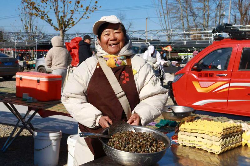 11月17日,“通州运河百年大集”西集大集重新开集,大集占地1.7万平方米,200余个摊位划分成“果蔬”“特色小吃”等七大功能区,所有摊主都经过了专业岗前培训,市场监管还会现场抽检。图为农户售卖自制的螺肉。