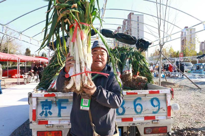 农户售卖自家种的大葱。