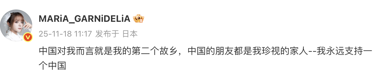 美依礼芽:我热爱和平,更热爱中国,作为歌手的我,能被这么多的中国歌迷认可和喜爱,是我人生最幸福的事情,中国的歌迷们总是给予我无数的爱与勇气,我始终尊重并热爱支持我的人和中国这片土地。