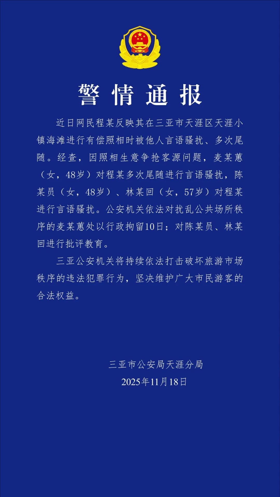 为抢照相客源多次尾随并言语骚扰顾客 女子被三亚警方行拘
