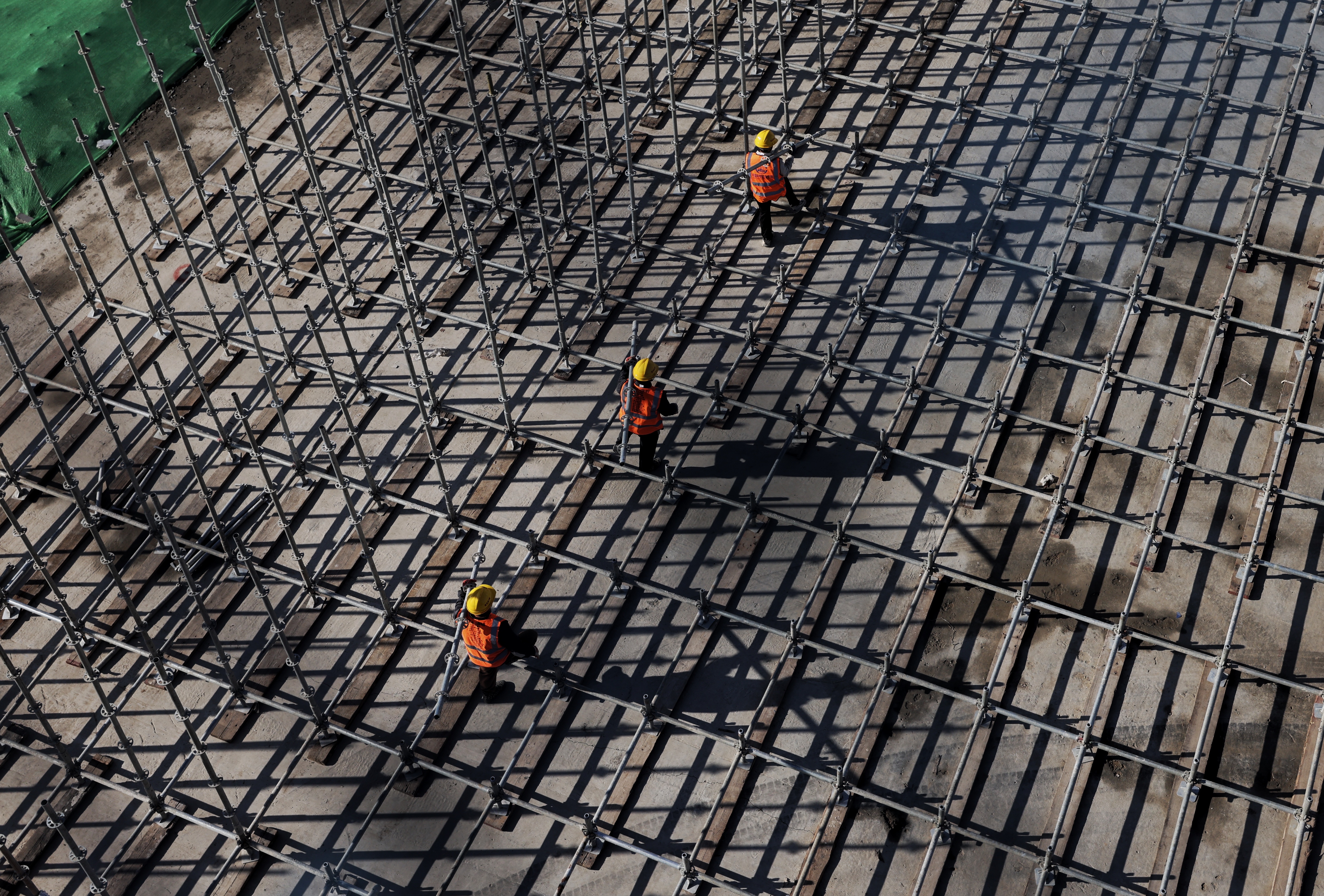 工程现场,工人们正在搭建脚手架。新京报记者 王贵彬 摄