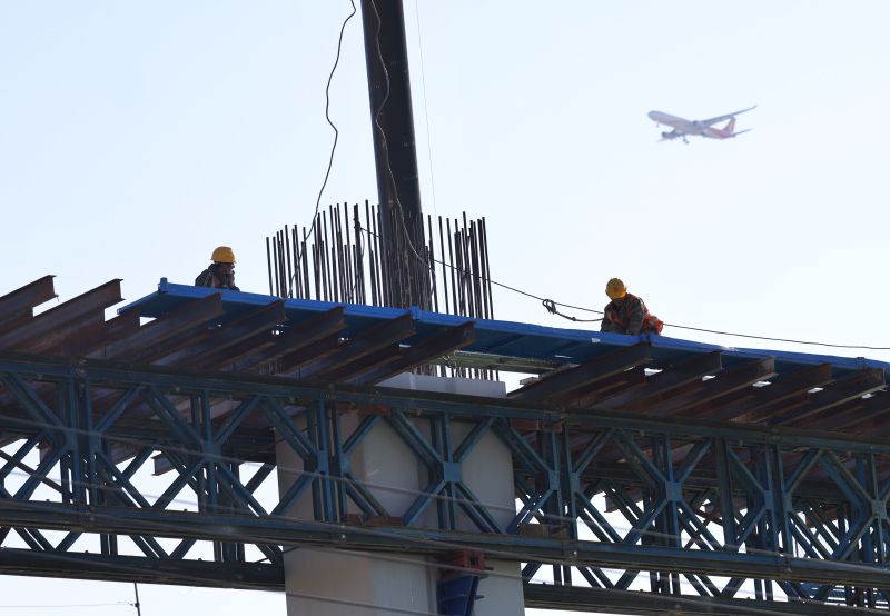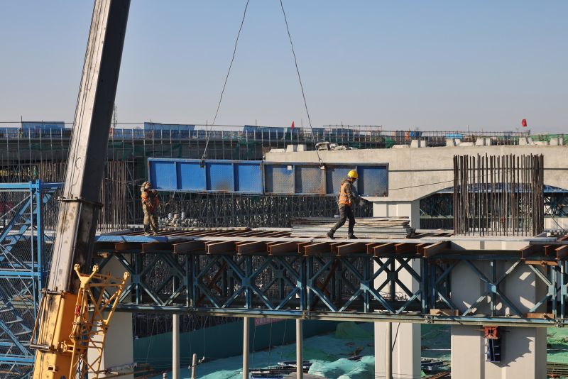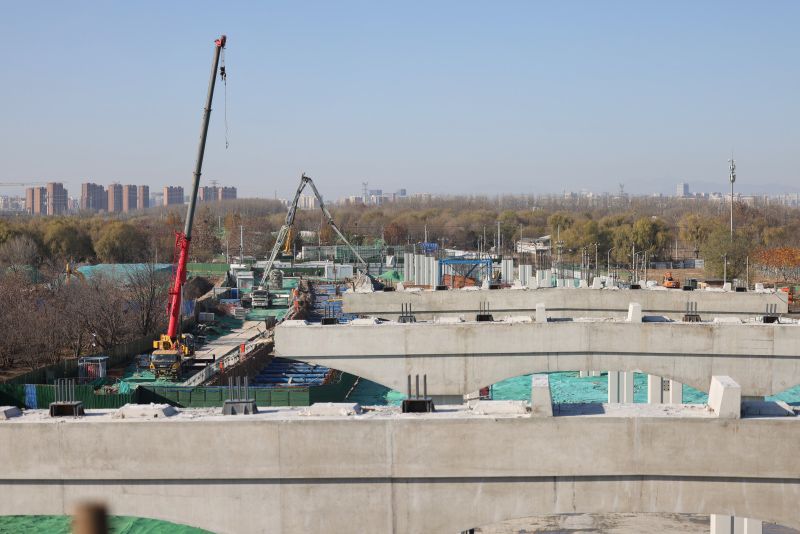 11月19日,工人们搭建脚手架。据首发集团公联公司亮马河北路工程负责人李桐介绍,目前,亮马河北路工程稳步推进,大部分桥梁下部结构已顺利收官,正集中力量推进桥梁上部结构现浇梁及预制梁施工。