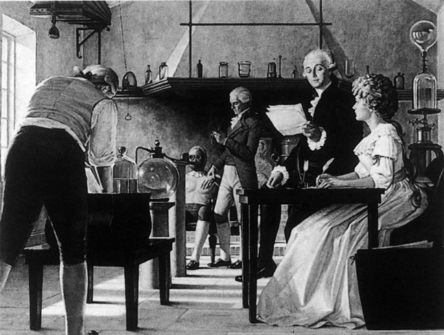 拉瓦锡夫妇经常在家举行一些科学集会,邀请巴黎的科学家们参加。图为拉瓦锡在集会上做实验演示,玛丽在对实验作详细记录。《化学基础论》(附《反燃素论》)插图