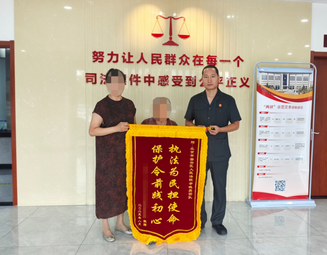 事后,刘老太和女儿给余晓磊(右)团队送上锦旗。密云法院供图