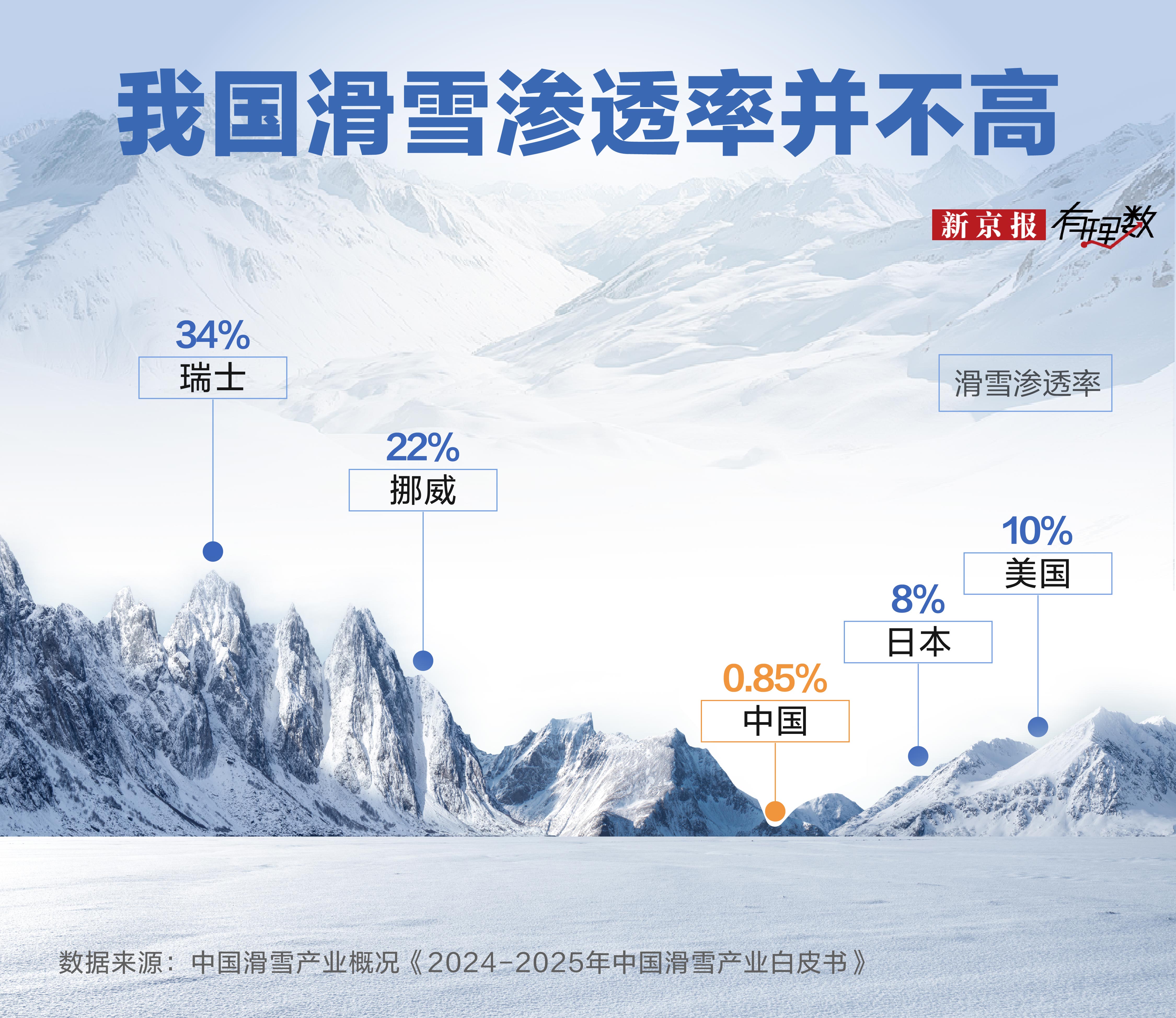 2024雪季数据显示,目前国内滑雪市场尚未形成稳定的滑雪消费群体,渗透率仅0.85%,而美国、日本滑雪人口渗透率都在10%左右,挪威瑞士更是超过20%。在这些国家,许多人从小就学习滑雪,并将其视为生活方式的一部分,这也意味着,滑雪人群的年龄层会更丰富。