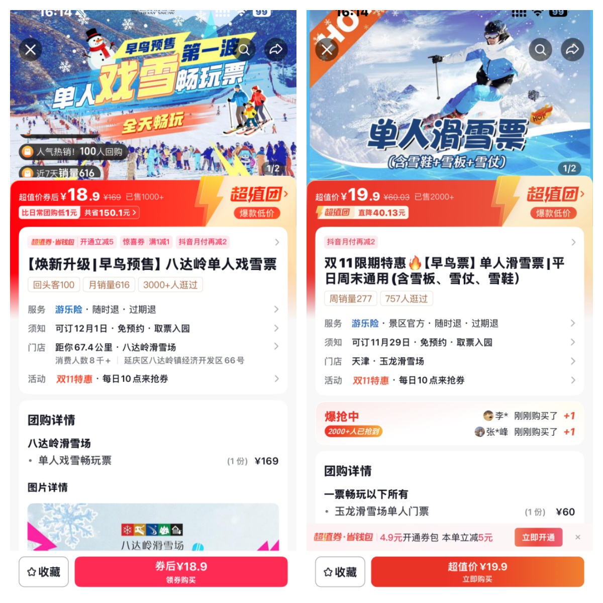 以滑雪热门地河北张家口为例,近几年当地滑雪场数量大幅扩容,竞争愈发激烈,多家雪场纷纷下调价格,百元内就能拿下门票,和此前两三百元的定价形成鲜明对比。一些其他雪场甚至在团购平台上推出19.9 元、29.9元的超低价雪票,堪称“白菜价”体验。