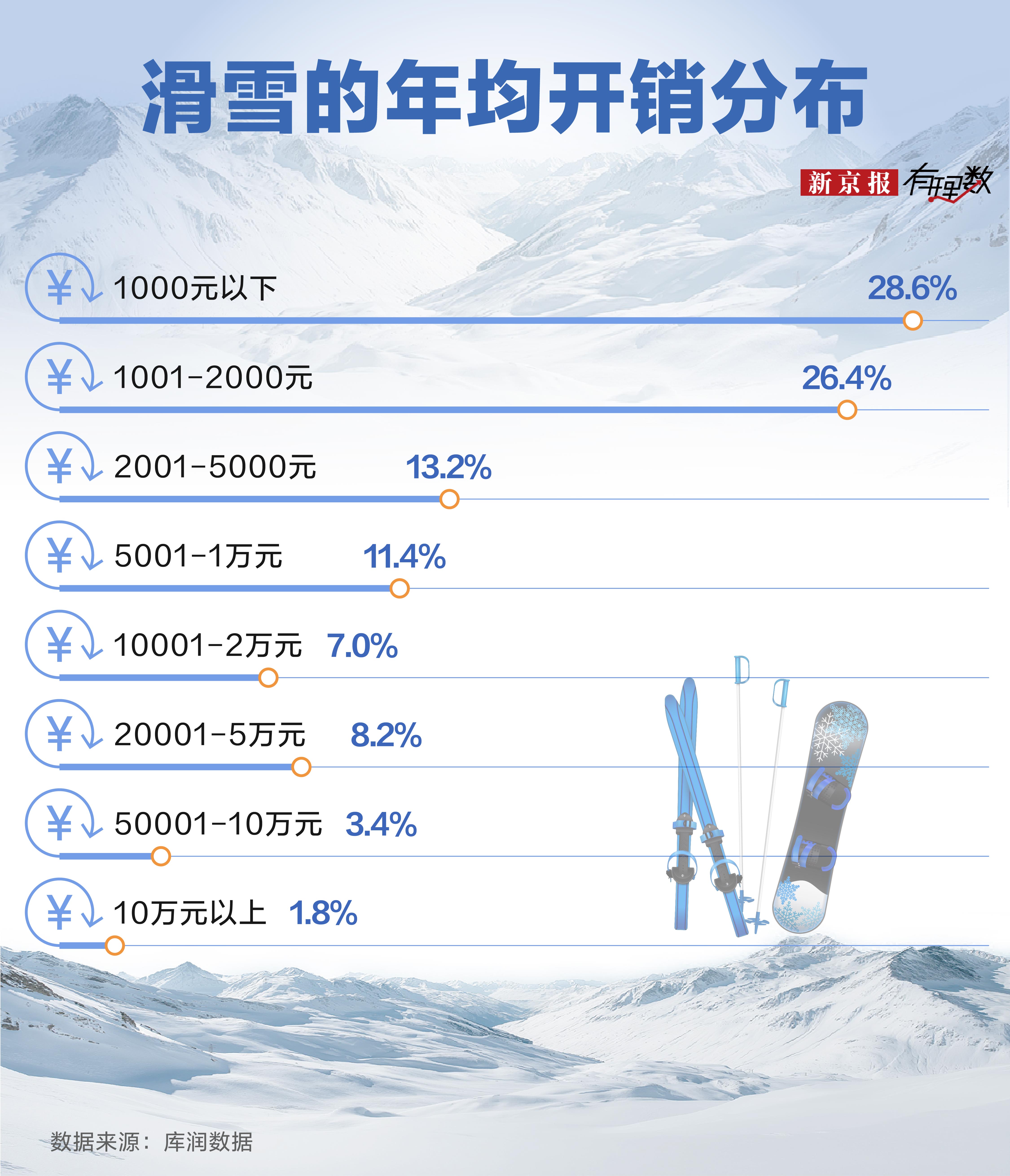 一套入门级别的雪板、雪鞋与雪服,总价约在5000元;若选择中高端装备,花费则轻松突破万元。再加上雪季卡、培训课程等相关支出,费用轻松过万。《2021滑雪圈层研究》数据显示,接近一半的核心用户每年在滑雪上的支出超过1万元。