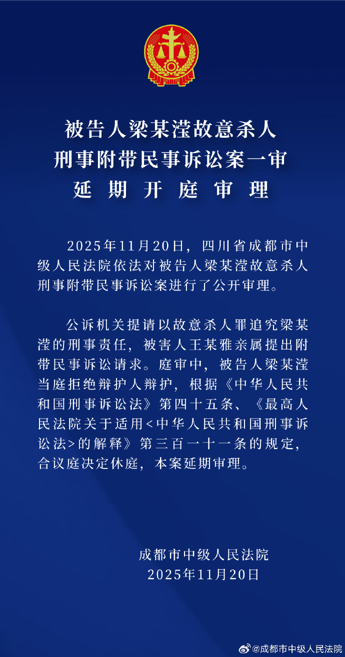 新京报讯 11月20日,四川省成都市中级人民法院发布被告人梁某滢故意杀人刑事附带民事诉讼案一审延期开庭审理。