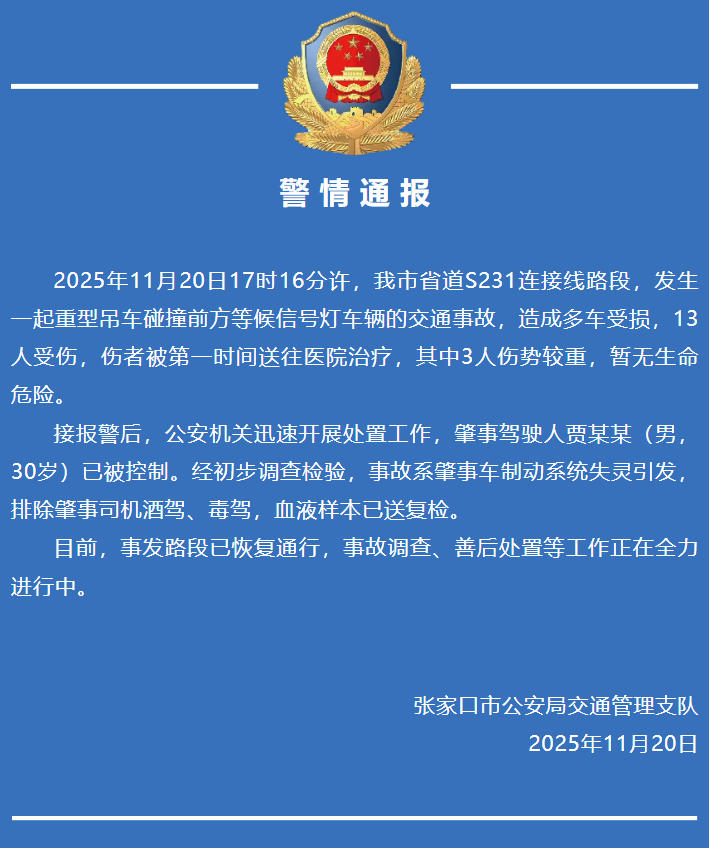 河北张家口一重型吊车连撞多车致13伤,警方通报