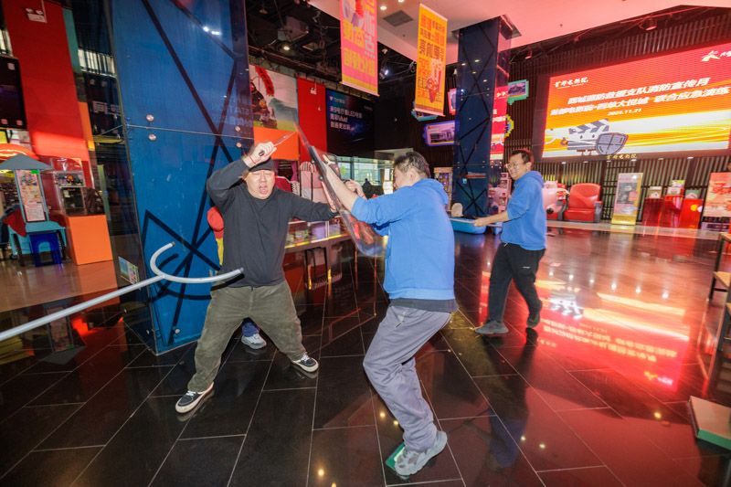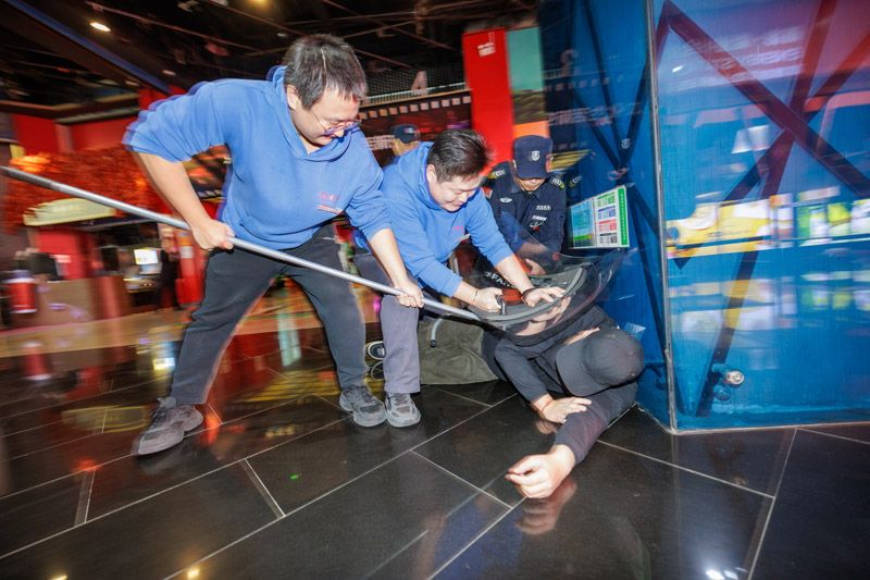 面对“持刀歹徒”和“可疑爆炸物”,影院应急处置组员工手持防暴钢叉和盾牌,迅速形成战术队形,与“歹徒”对峙周旋,将其控制在一定范围内。