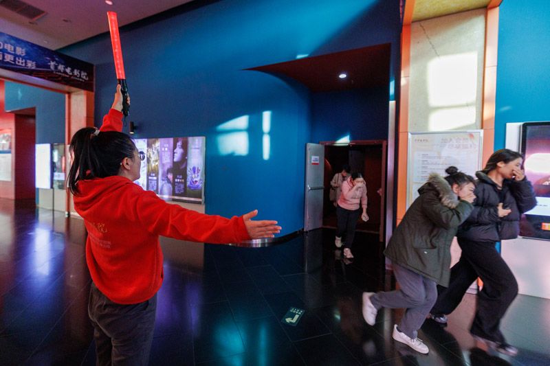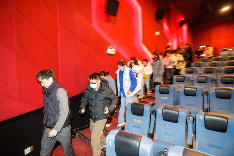 8时30分,一场消防应急演练在首都电影院拉开帷幕。图为观众有序撤离。