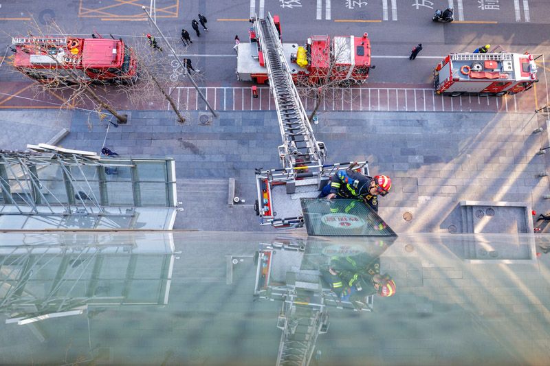 西城消防救援支队的消防救援人员抵达现场,云梯车缓缓升起。