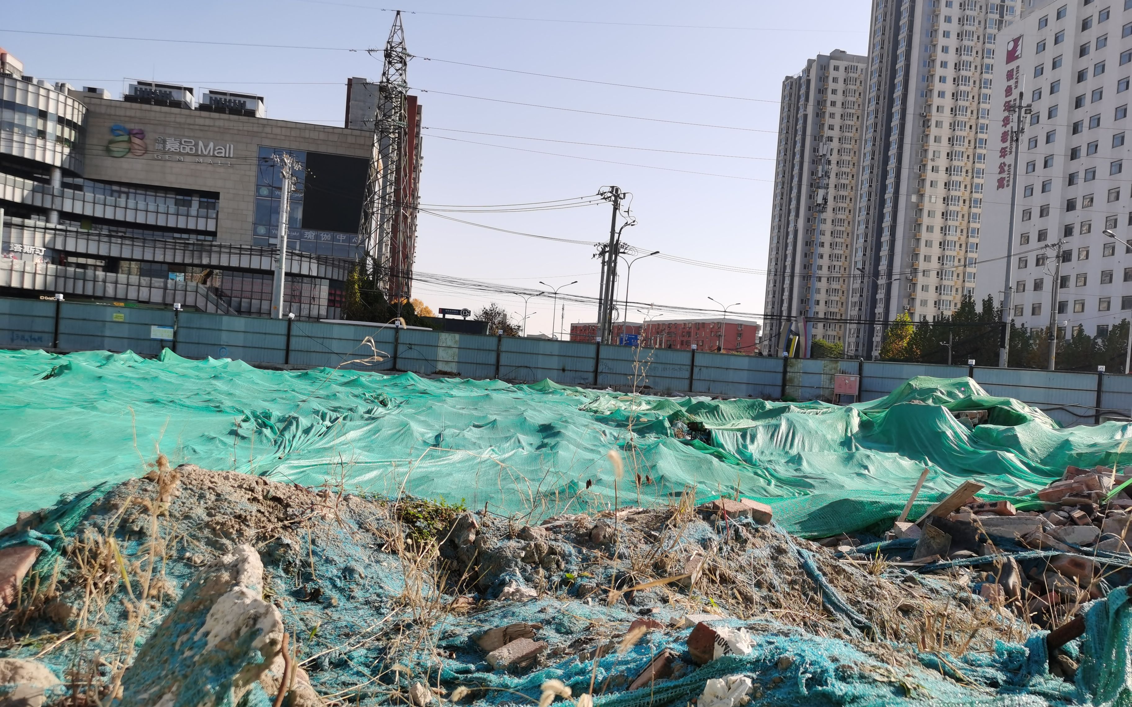 工地内杂草丛生,部分区域被绿色苫布遮盖。新京报记者 戴轩 摄