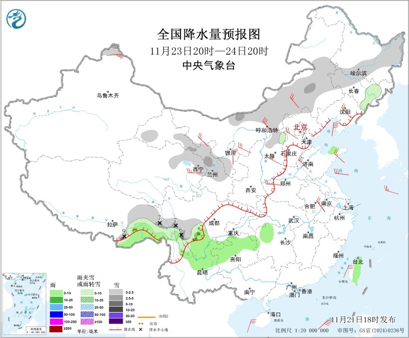 11月23日20时至24日20时,青海东北部、甘肃中部、内蒙古中东部、东北地区中北部、西藏东部、四川西南部等地部分地区有小到中雪或雨夹雪,其中西藏东南部和川西高原西部等地部分地区有大雪(5~9毫米);西藏东南部、四川南部、重庆南部、云南北部、贵州中北部、湖南北部等地部分地区有小到中雨。内蒙古大部、西北地区中北部、华北、东北地区南部、黄淮、江淮、江南北部等地部分地区有4~5级风、阵风6~7级;渤海、黄海北部、巴士海峡、南海北部和中部等海域将有6~7级风、阵风8级(见图3)。