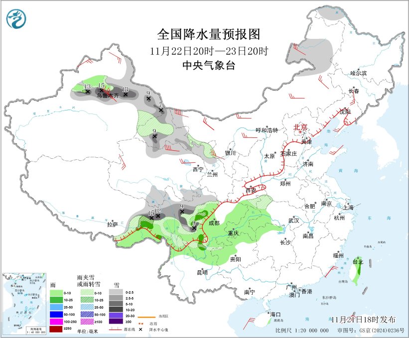 11月21日20时至22日20时,黑龙江西北部、新疆北部和南疆盆地、西藏东部和西北部、西北地区中部、川西高原北部等地部分地区有小雪或雨夹雪,其中,新疆北疆北部、西藏东北部、青海南部、川西高原北部等地部分地区有中到大雪,新疆北疆北部等地局地暴雪(10~15毫米)。西藏东南部、西南地区东部和南部、台湾岛等地部分地区有小雨,其中,四川西北部局地有中雨。内蒙古中西部、新疆北部和东部、西藏北部等地部分地区有5~6级风;南海中东部海域将有6~8级风、阵风9级,台湾海峡、台湾以东洋面、巴士海峡、南海西部和东北部海域将有6~7级风、阵风8级(见图1)。