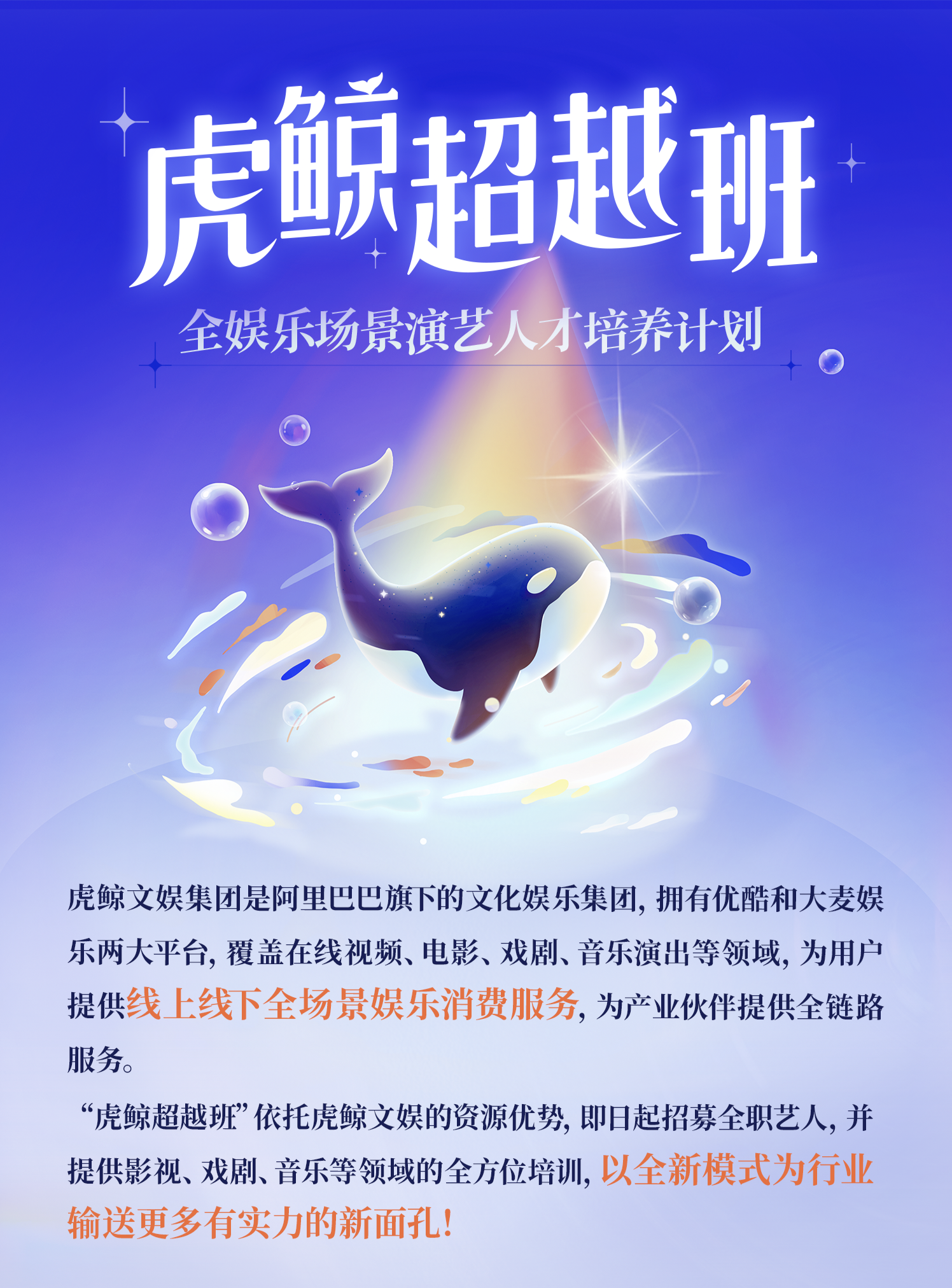 在国内影视与舞台表演行业普遍面临“新人难冒头、就业不稳定、机会高度集中”的现实背景下,虎鲸文娱于11月17日宣布推出国内首个全娱乐场景演艺人才培养计划——“虎鲸超越班”。这一举动,不仅是一次人才战略层面的调整,更是一种教育方式、行业结构乃至人才生态上的革新探索。