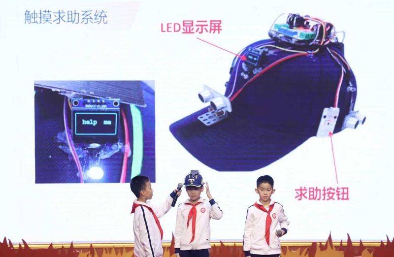 开幕式上,小学生介绍“盲人安全帽”,安全帽通过超声波避障、声光震动多维度预警,结合语音导航与太阳能供电,为视障人群出行提供便利。