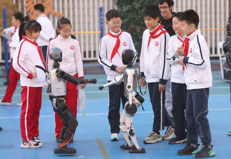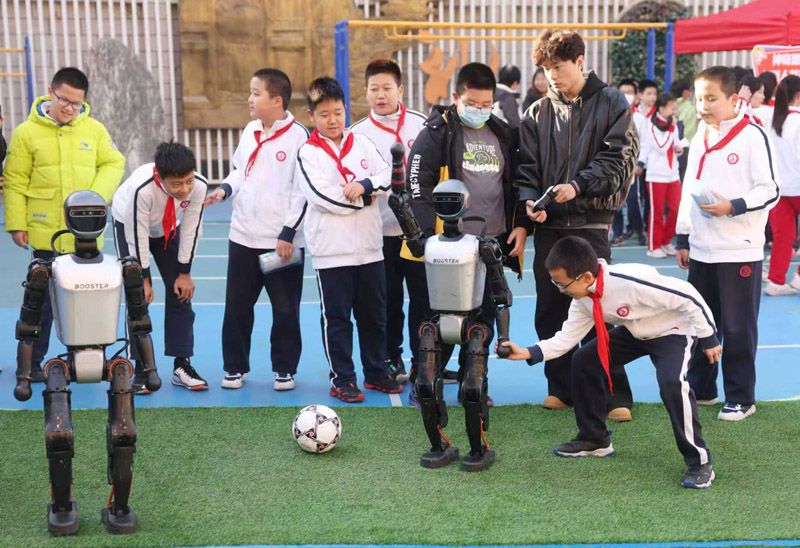 11月21日,“智汇科技 创享未来”板厂小学第十五届科技节开幕,众多科技社团活动集中展示学校科技教育的丰硕成果。各校区同步开启丰富多彩的科技特色活动,让同学们沉浸式感受科技魅力。图为机器人社团学生围观人机互动足球赛。