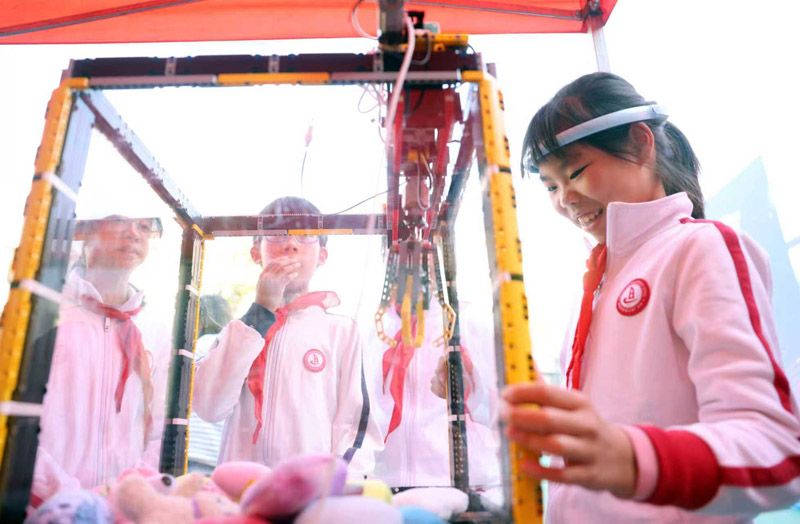 学生体验脑控抓娃娃。