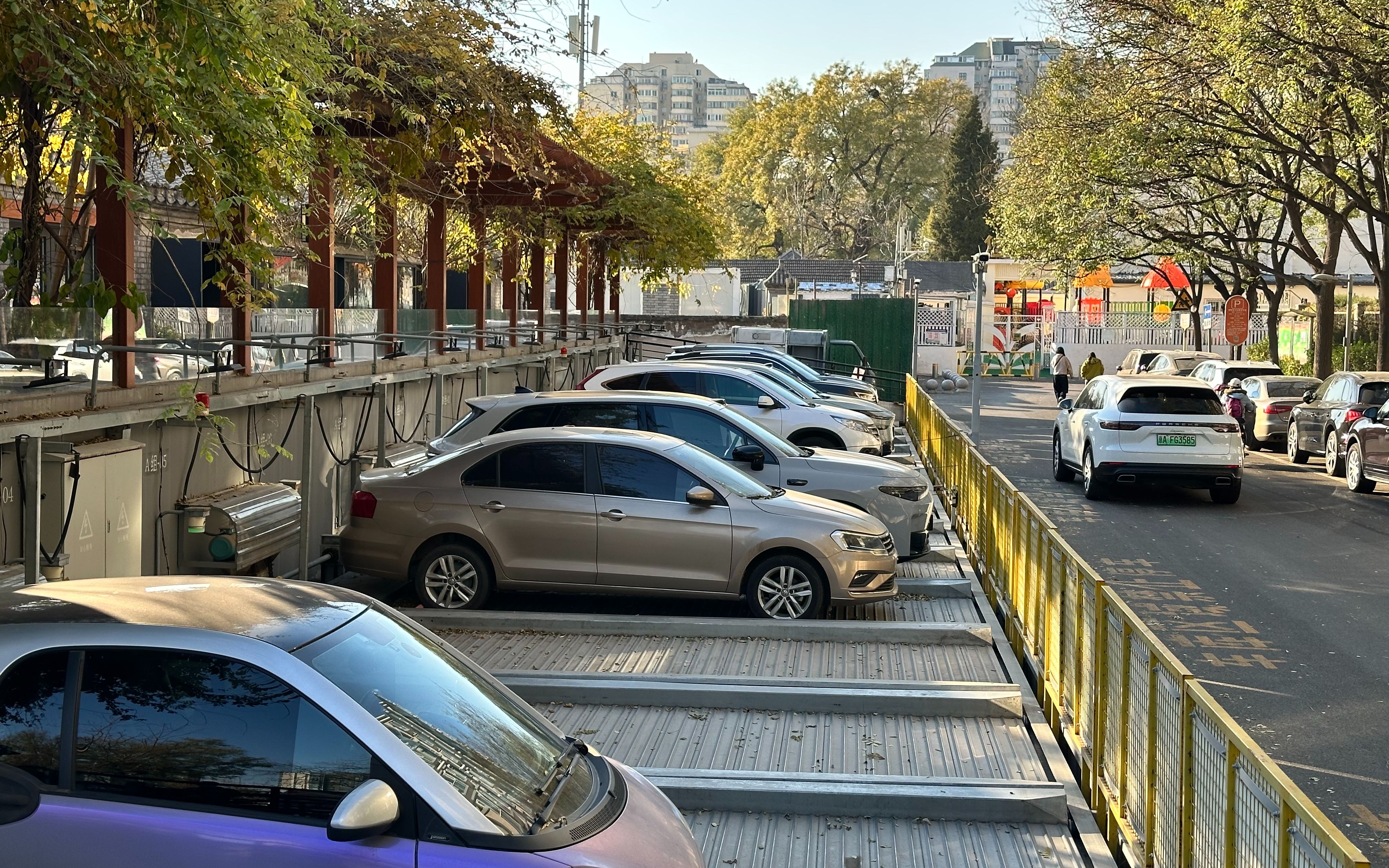在烂缦胡同北口,一处拥有32个车位的地下式立体停车设施为不少居民和商户解决了停车难题。“改造前,这里是一处闲置的施工空地,我们改建为立体停车场,办理过停车认证的居民可以用小程序控制停车设施,分为上下两层。”西城区宣房大德公司投资部王聪告诉记者,这处停车设施配合路侧车位,烂缦胡同居民的停车问题基本能得到解决。