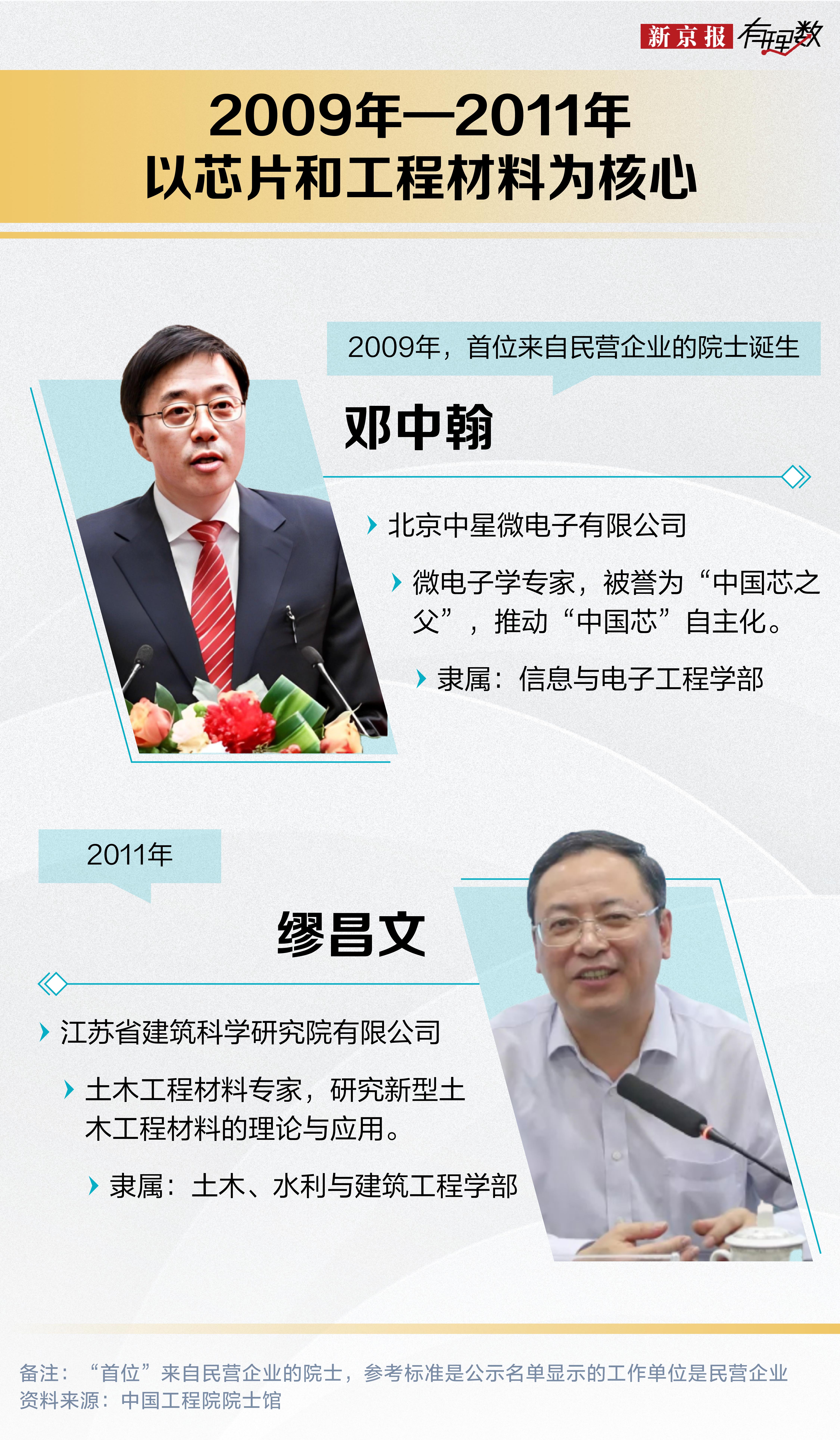 如果以公示名单上的工作单位为依据,首位来自民营企业的院士是 2009 年当选的中星微电子创始人邓中翰。此后十余年间,工程院累计有 6 位院士来自民企。2025 年单届新增 3 位,几乎相当于此前总量的一半。