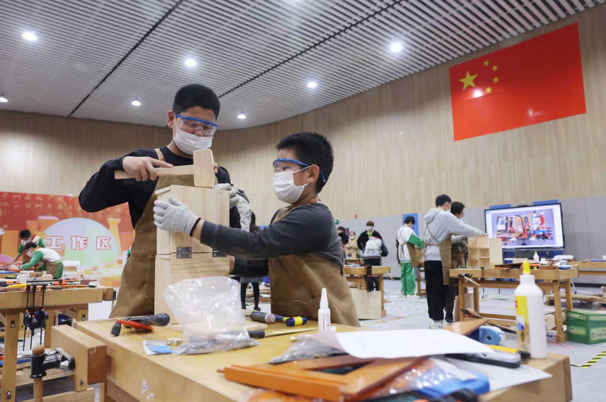 学生们在参与“匠心创做”木工制作比赛。新京报记者 李木易 摄