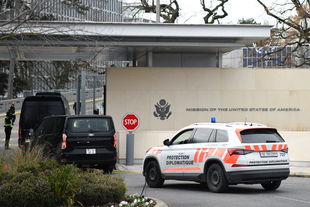 11月23日,在瑞士日内瓦,外交车辆进入美国常驻联合国日内瓦办事处代表团驻地。新华社记者连漪摄