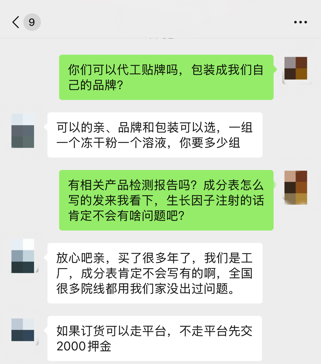 然而,在非正规医美市场中,它仍被包装成能刺激“自体胶原再生”的注射材料,不断吸引着求美者。这些产品常常改头换面,以“活性细胞液”“生长肽”“细胞激活素”等名称,通过熟人介绍、社交平台引流等隐蔽方式流通,一条完整的地下产业链仍在悄然运行。