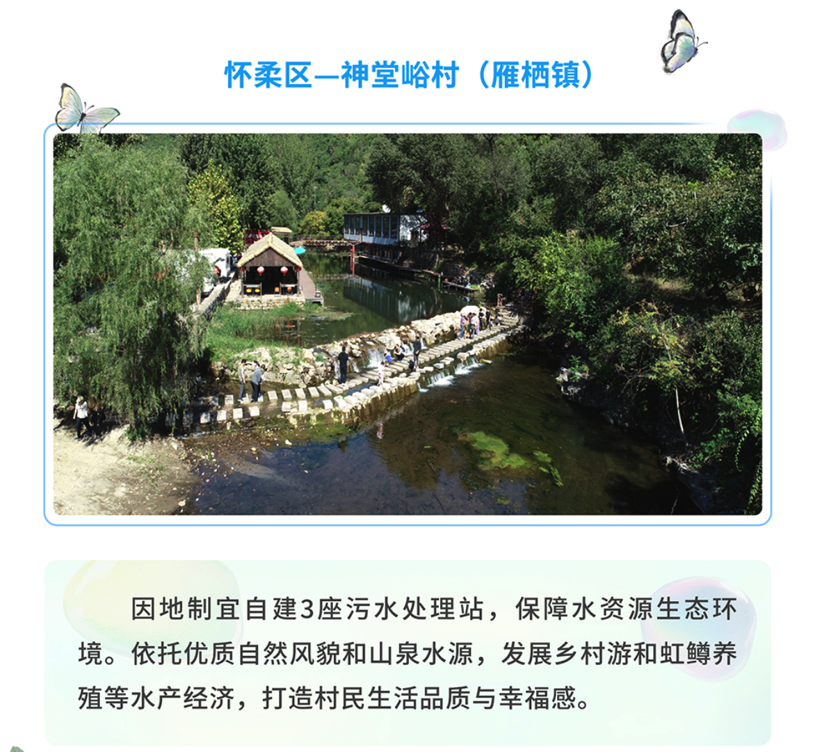 怀柔神堂峪村依托优质自然风貌和山泉水源,发展乡村游和虹鳟养殖等水产经济,打造村民生活品质与幸福感。
