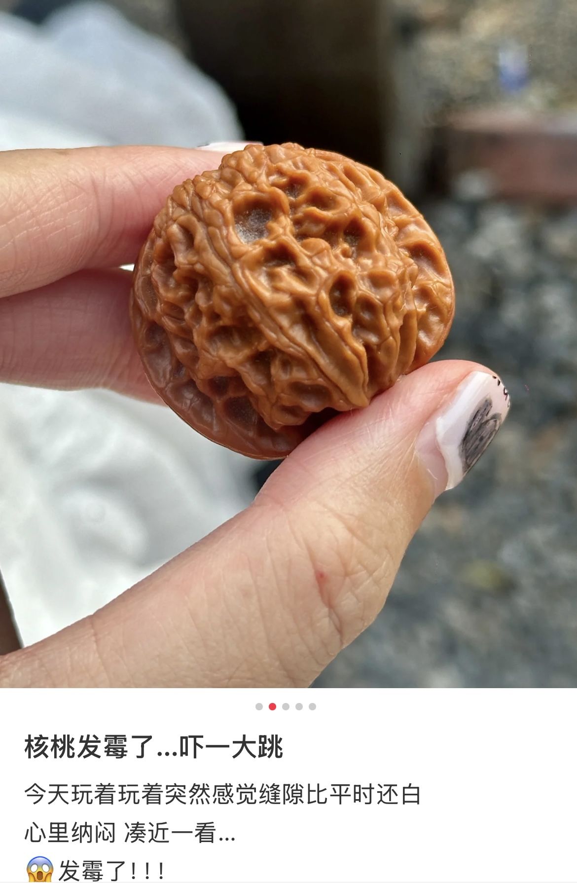 这类核桃表面会有刺激性异味,如果长期把玩,可引发皮肤红肿、刺痛,一些过敏体质的人还会出现水泡、皮炎等现象。