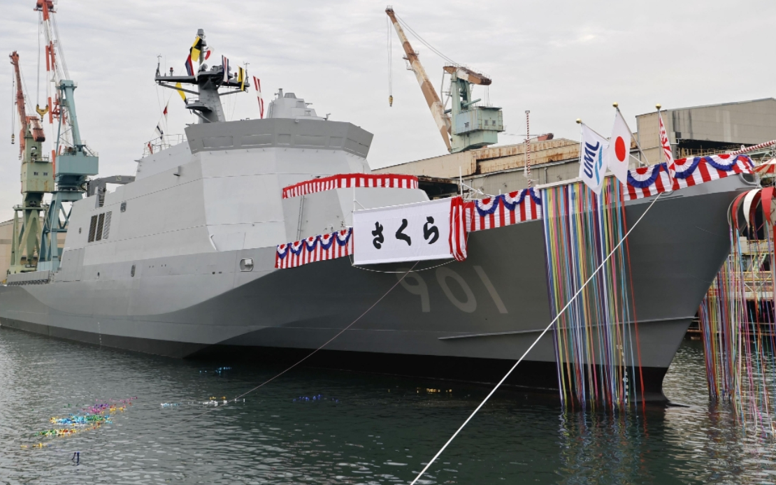 当地时间2025年11月13日,日本东京附近的横滨市,日本海上自卫队新型巡逻舰“樱花号”举行下水仪式。该舰将于2027年正式服役。图/IC