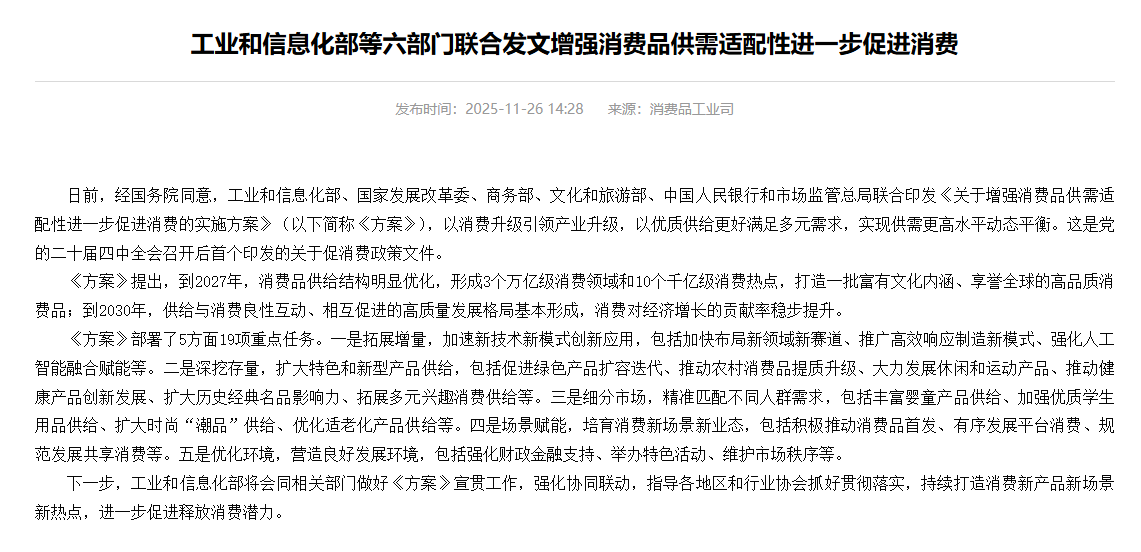 工信部等六部门联合发文增强消费品供需适配性进一步促进消费