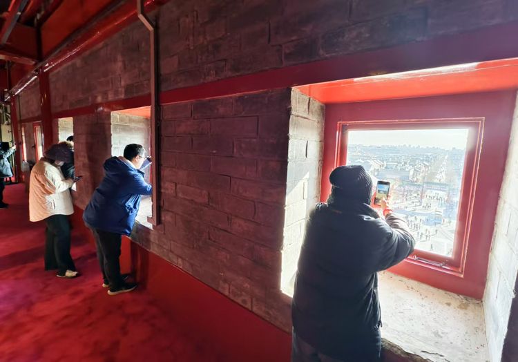 2024年12月,正阳门箭楼正式向社会公众开放,市民从箭窗俯瞰南中轴线。资料图片/新京报记者 浦峰 摄