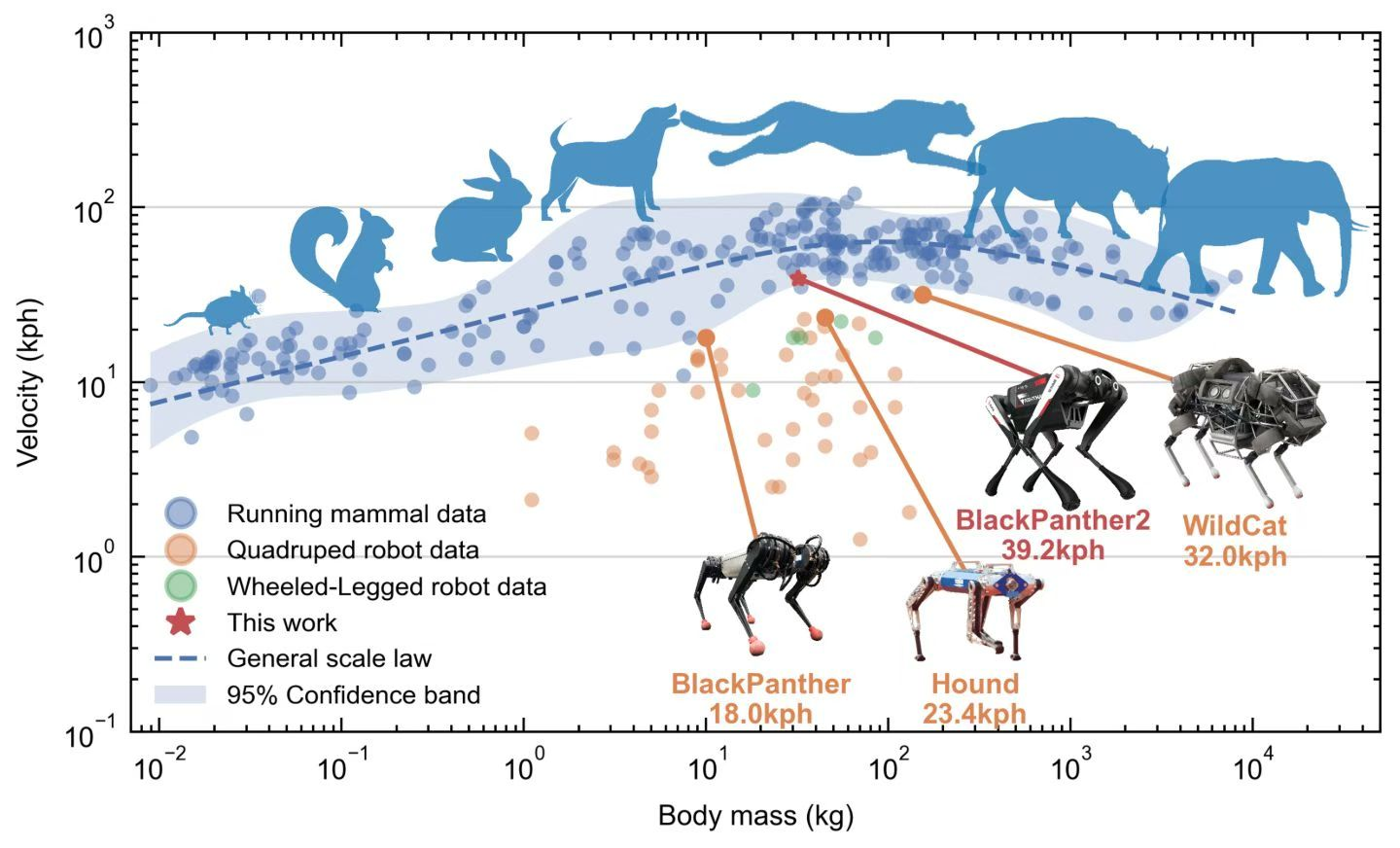 相较于自然界奔跑哺乳动物(如野猫 32.0kph、猎犬 23.4kph),黑豹 Ⅱ 当前 39.2kph(13.2m/s)的速度已处于领先水平,而其终极目标是挑战 33m/s(120km/h)的仿生生物速度极限,让机器人在未来具备远超自然界的机动能力。这种“以技术突破自然限制”的定位,正是“超物种”概念的核心内涵。