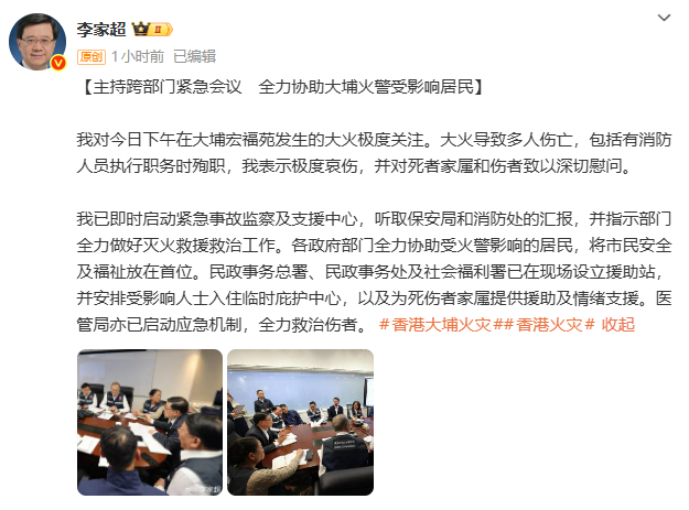 新京报讯 11月26日,香港大埔宏福苑火灾已导致多人伤亡。香港特别行政区行政长官李家超发布微博,表示“对死者家属和伤者致以深切慰问”,并指示部门全力做好灭火救援救治工作。