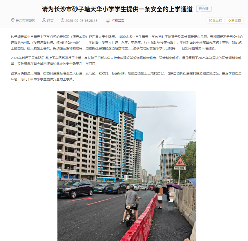 9月26日,长沙市雨花国有资产经营集团有限公司回复了天湘路及红星一路学校段建设进展,并表示,已成立专项工作组,每周调度天湘路、红星一路建设进度,优先保障学校周边路段施工,确保12月底前完成学校段主体及配套工程,彻底消除通行隐患;已向信和地产下发管理要求,要求其严格管控地块出入车辆,严禁在7:00-8:30/16:30-18:00上下学时段进行重型机械作业或材料运输,减少对学生通行的干扰。