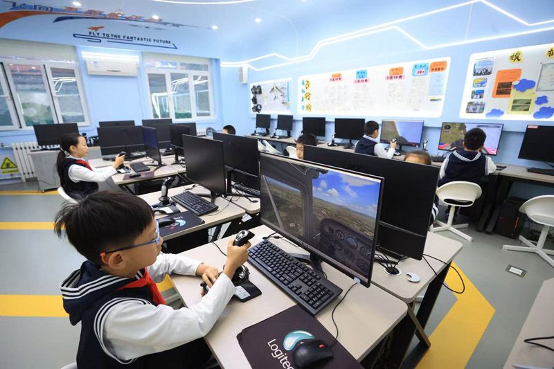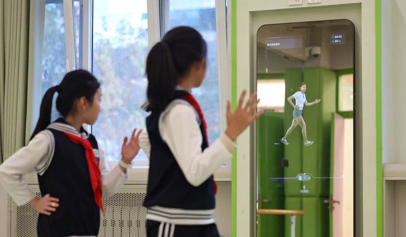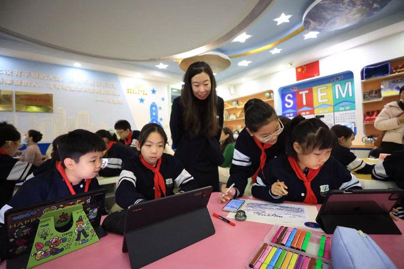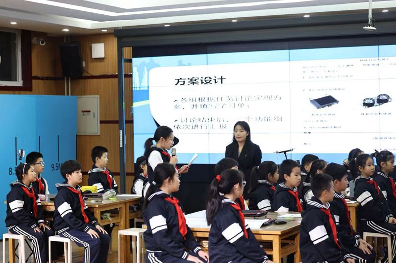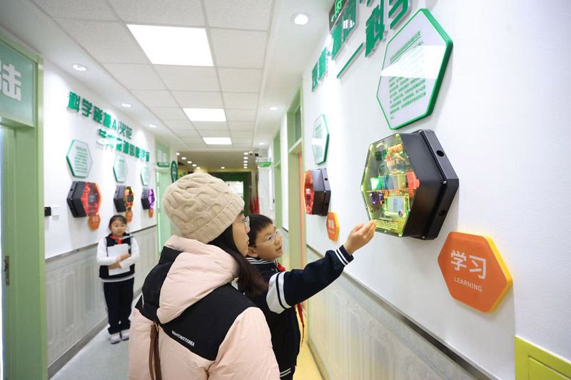 11月27日,朝阳区实验小学开展以“数智赋能‘育’见成长:‘人工智能+教育’新生态实践探索”为主题的融创课堂研讨活动。活动分为数智成果互动展示、“融创课堂”观摩、《跟着课本去旅行》特色展示、学校主旨报告、数智赋能特色课程介绍等部分。图为学生向参观老师介绍AI智能展墙。