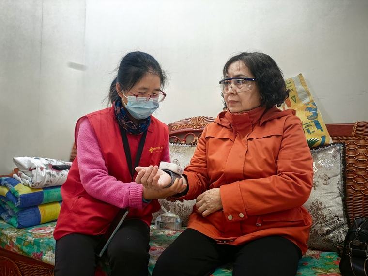 11月18日,长沙雨花区,护理员张美玲上门为75岁的陈若冰(右)服务,服务内容包括测量血压、家庭清洁等。新京报记者 寇家祥 摄