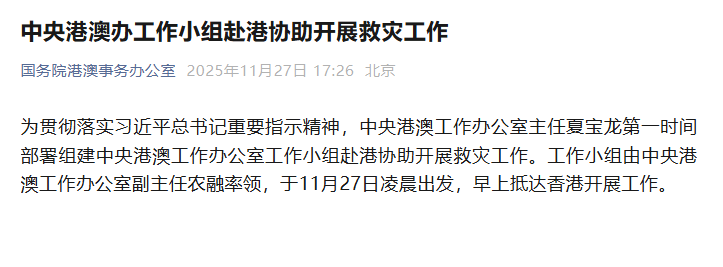 新京报讯 据国务院港澳事务办公室微信公众号消息,为贯彻落实习近平总书记重要指示精神,中央港澳工作办公室主任夏宝龙第一时间部署组建中央港澳工作办公室工作小组赴港协助开展救灾工作。工作小组由中央港澳工作办公室副主任农融率领,于11月27日凌晨出发,早上抵达香港开展工作。