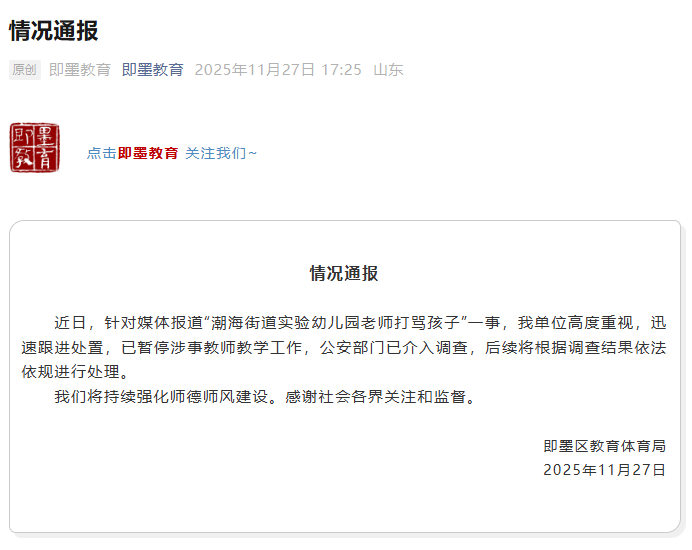 新京报讯 11月27日,即墨区教育体育局发布情况通报,近日,针对媒体报道“潮海街道实验幼儿园老师打骂孩子”一事,单位高度重视,迅速跟进处置,已暂停涉事教师教学工作,公安部门已介入调查,后续将根据调查结果依法依规进行处理。