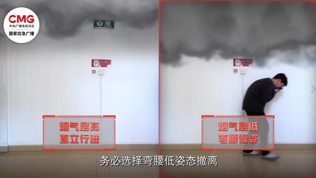 1. 撤离过程中若烟气层靠上,并未影响正常呼吸,可快速直立行进;但浓烟已至口鼻处影响呼吸时,务必选择弯腰低姿态撤离,如有条件可佩戴自滤式呼吸器。