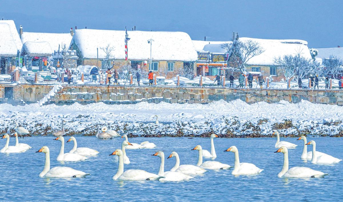 11月25日,在荣成市俚岛镇烟墩角村的海湾中,近千只从西伯利亚远道而来的大天鹅悠然栖息。它们或低头啄食,或翱翔嬉戏,来自全国各地的游客架起“长枪短炮”定格天鹅的优雅风姿。这个曾被联合国旅游组织评为“世界最佳旅游乡村”的滨海村落,不仅是观鸟胜地,亦是荣成“零碳”实践的窗口。