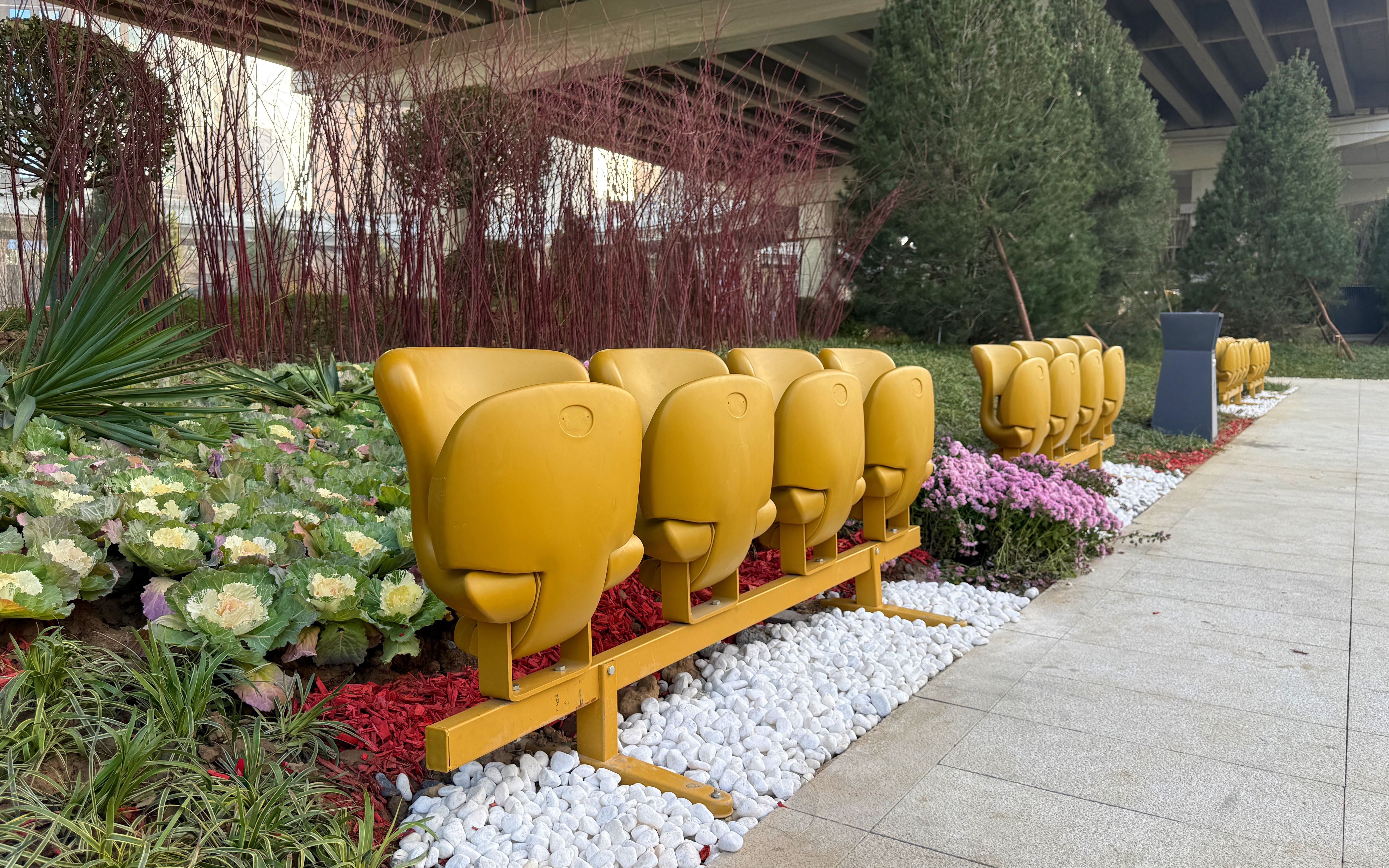 记者注意到,国贸桥下“漫行廊道”内还搬来了今年九三阅兵时天安门广场的金色观礼座椅。钟鎛告诉记者,这样的座椅休息区域共有十几处。