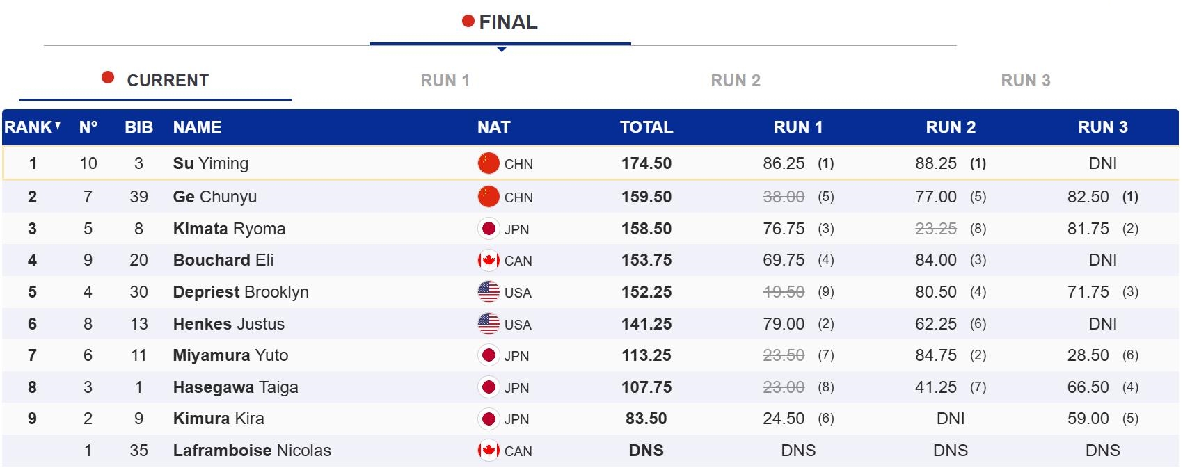 第一跳,苏翊鸣1980惊艳落地,得到86.25分。第二跳,凭借完美发挥,他拿到88.25分。最终,苏翊鸣以174.50分的总成绩强势夺冠。另一位中国选手葛春宇以159.50分收获银牌。