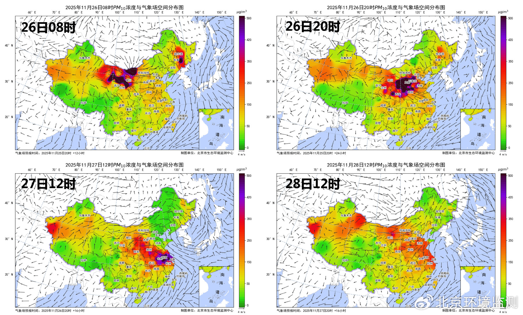 11月26日至28日PM10浓度空间演变。图/北京市生态环境监测中心