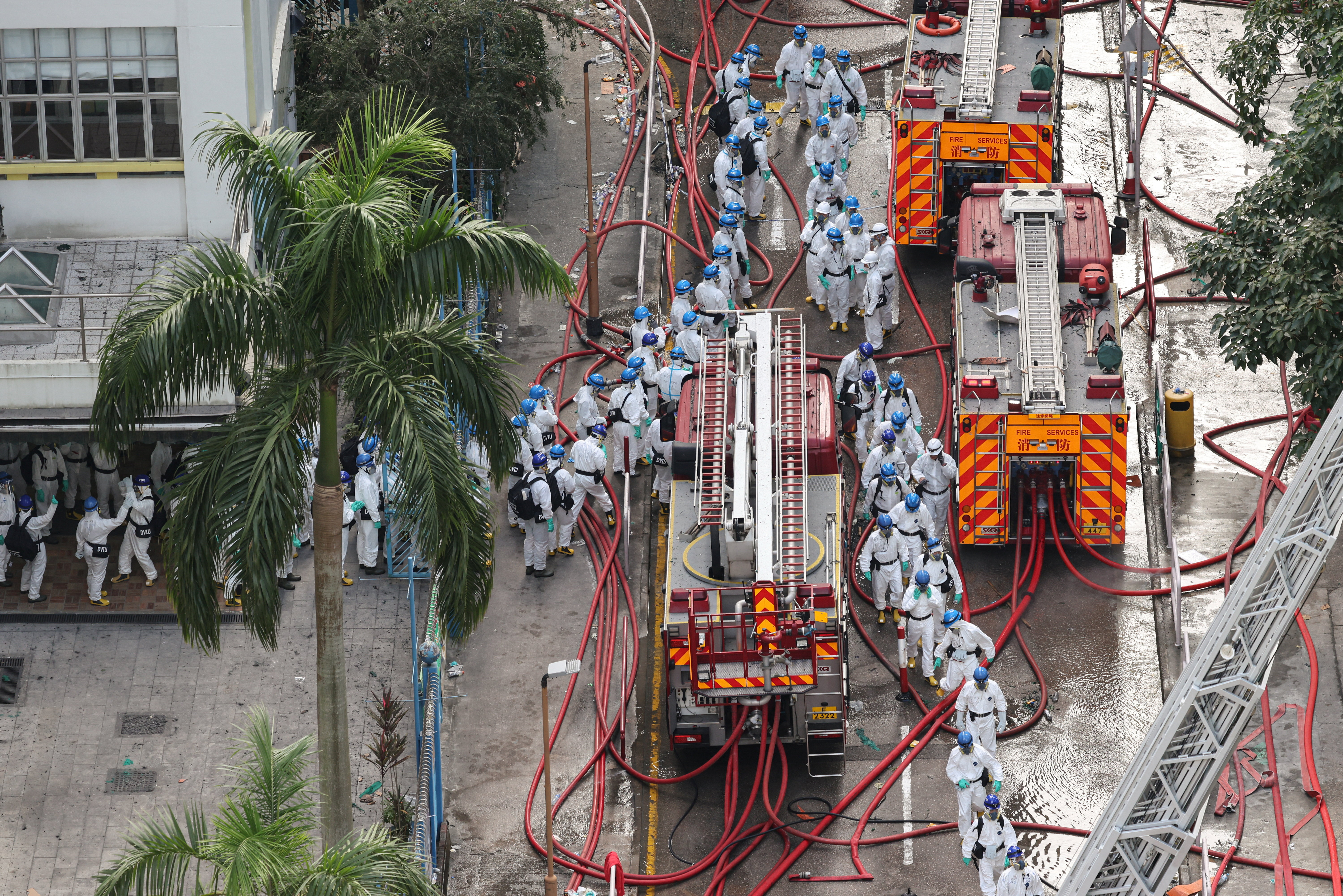 2025年11月27日,消防人员在香港大埔宏福苑火灾现场进行救援工作。图源IC